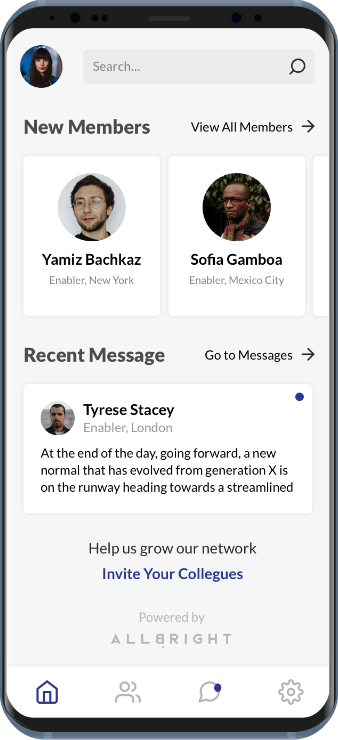 Dashboard view allows users to have a quick view on the latest updates. Users can scroll through the newest community members who have joined the platform or check how many new unread messages they have in the inbox.