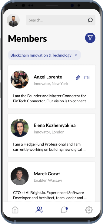 Effortless search for members or business opportunities - an ultimate timesaver for busy professionals. Set relevant filters and find people in your location who are interested in specific fintech initiatives.