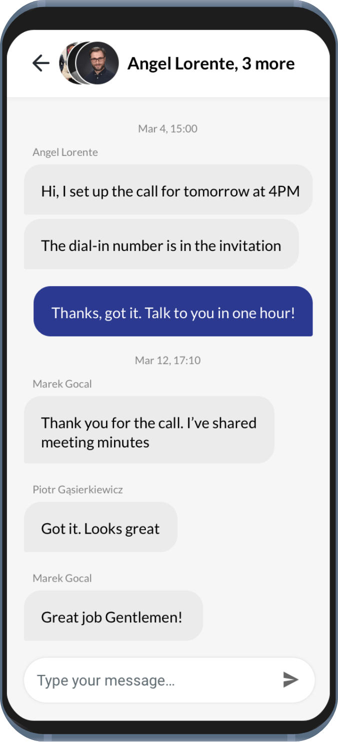 Message threads with real-time messaging designed for easy and efficient communication. Add new members to the communication anytime you need it. Easy access to the member profiles helps maximise business opportunities from each conversation.