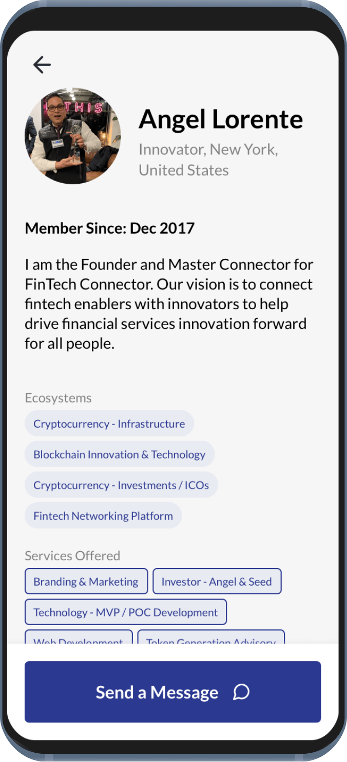 Profile view provides detailed information about each community member, including: Professional information, Fintech ecosystem, Areas of business interests